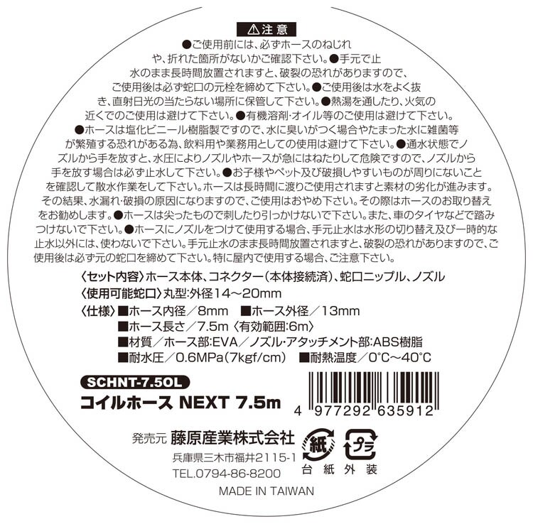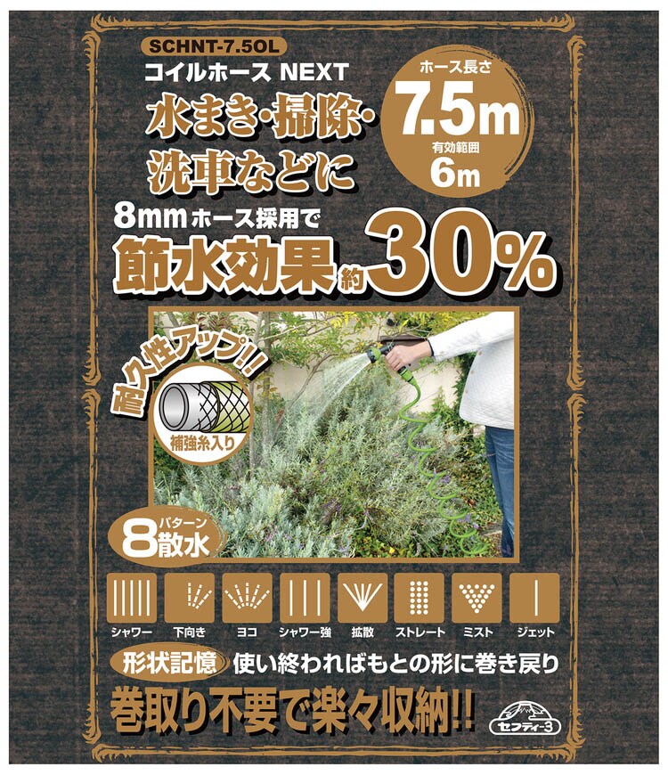 | ホース長さ:7.5m、有効範囲:6m。 ホース内径:8mm。 散水ノズル:8パターン。 切替タイプ:シャワー・下向き・ヨコ・シャワー強・拡散・ストレート・ミスト・ジェット。 ★材質 ホース:EVA。 ノズル・アタッチメント:ABS。 |