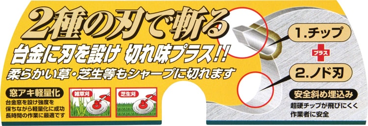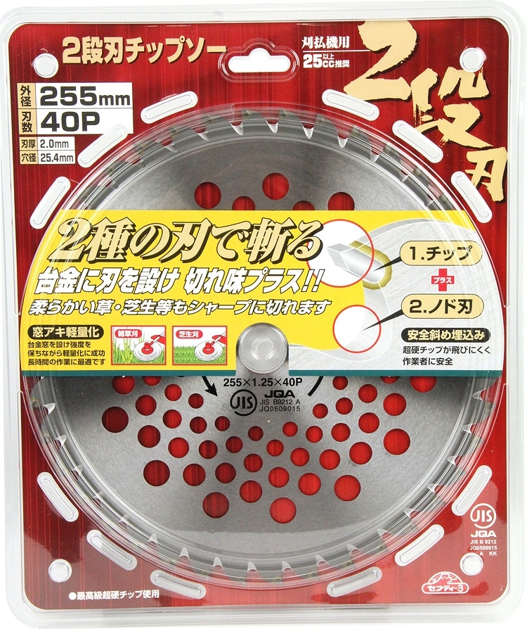 | ・外径:255mm ・刃数:40P ・刃厚:2.0mm ・穴径:25.4mm ・台金厚:1.25mm ・刈払機推奨排気量:25cc以上 ・最高級超硬チップ使用 ・JIS規格適合商品 |
