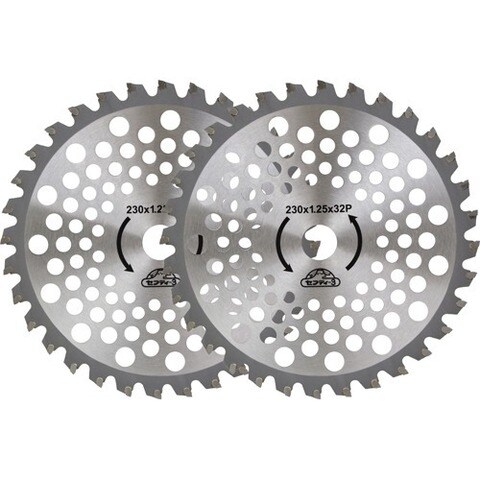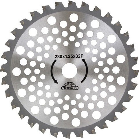 | ・外径:230mm ・刃数:32P ・刃厚:1.25mm ・穴径:25.4mm ・刈払機推奨排気量:25cc未満 ・2枚組 |