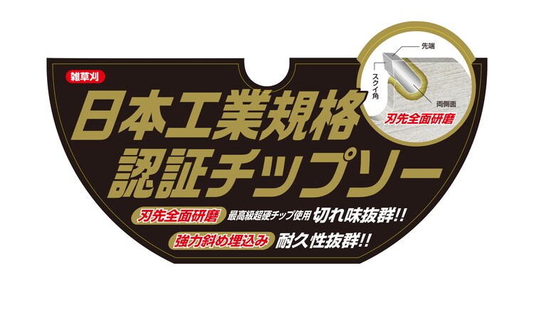 ・作業終了時にはエンジンを停めチップソーを刈払機から取り外してチップソーにヒビ割れ、変形、摩耗等の異常が無いか点検確認して下さい。もしヒビ割れ、変形等の異常の場合は絶対に再使用せずに破棄して下さい。摩耗の場合は清掃の上で適切な目立てをして下さい。次回使用のために防錆油等で防錆処理の後に幼児の手の届かない安全な場所に保管してください。