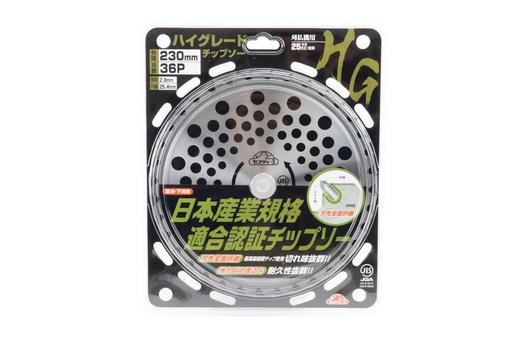 | ・外径:230mm ・刃数:36P ・刃厚:2.0mm ・穴径:25.4mm ・台金厚:1.25mm ・刈払機推奨排気量:25cc未満 ・JIS規格適合商品 ・1枚入 ・材質:台金:65Mn |
