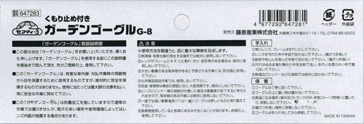 セフティー3 ガーデンゴーグル曇り止め付き G-8 (1個)