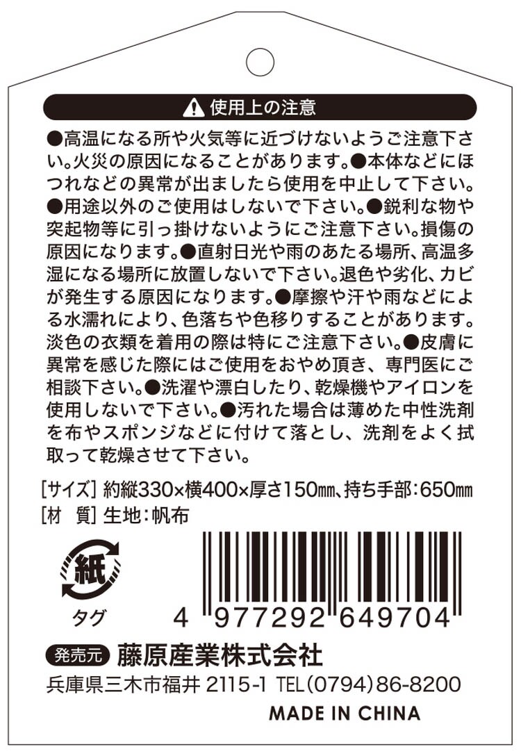 | サイズ:約縦330mm×横400mm×厚さ150mm。 手持ち部:65mm。 カラー:ブラウン。 ★材質 生地:帆布。 |
