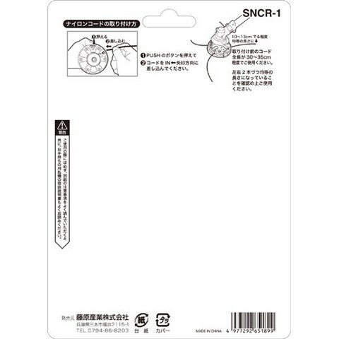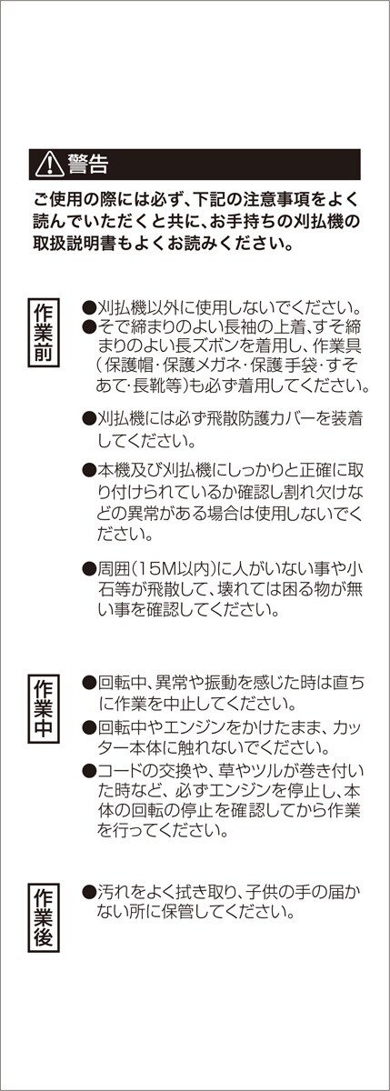 ・ご使用の際には必ず、台紙の注意事項をよく読んでいただくと共に、お手持ちの刈払機の取扱説明書もよくお読みください。