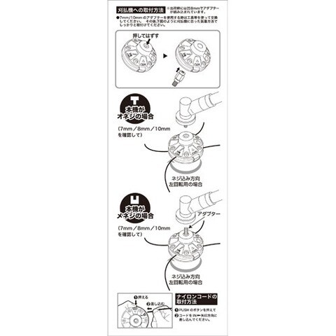 | ・適応ナイロンコード:○2.0~2.4mm・□2.2~3.0mm・ねじり2.2~2.4mm・ギザ刃3.0mm ・付属アダプター:7・8・10mm凹凸 ・チタニウムナイロンコード四角型直径2.2mm×長さ30cm・4本付 ・重量:約200g(コード・アダプター除く) ・出荷時凹8mmアダプター取付 ・材質:PA6+ナイロングラスファイバー |