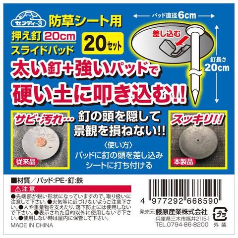 セフティー3 防草シート用押え釘20cmスライドパット パッド直径6cm×釘長さ20cm (20本入)