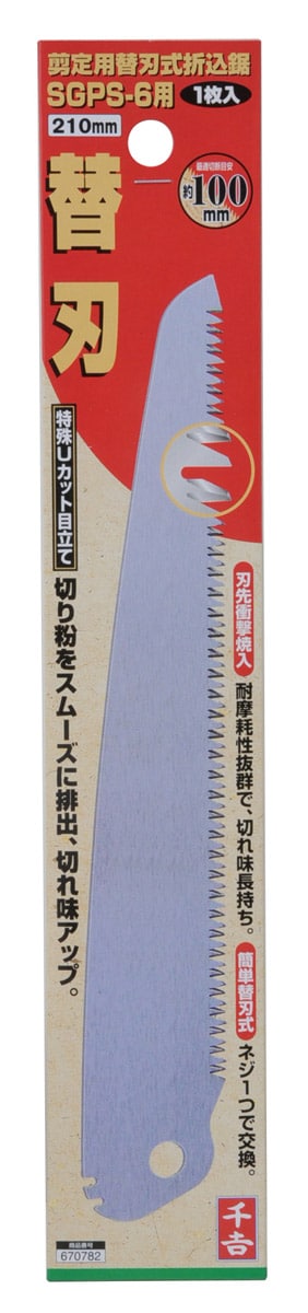 | ・刃長:210mm ・最適切断目安:約100mm ・適合本体:千吉剪定用替刃式折込鋸210mm・SGPS-6 ・材質:刃部:刃物鋼 |