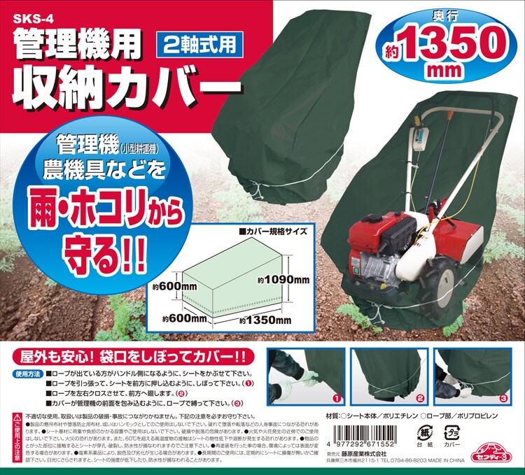 ●管理機(小型耕運機)を使用しない時の雨・ホコリから守ります。