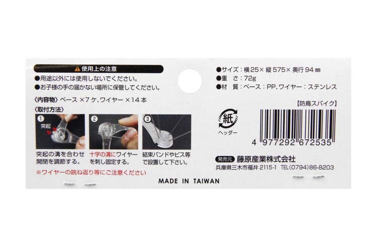 | ・用途:鳥の飛来・動物の侵入防止 ・サイズ:長さ約50cm ・重量:72g ・材質:ABS樹脂、ステンレス |