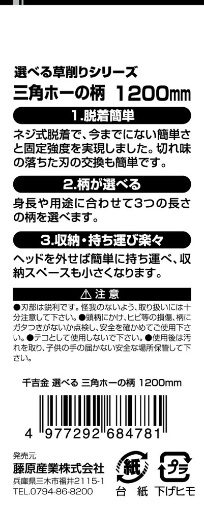 | ・柄長(約):1200mm ・材質:椎 ・取付金具付 ・関連商品:千吉金・選べる三角ホー・ヘッド各種 ・材質:柄部:木。取付金具:ステンレス |