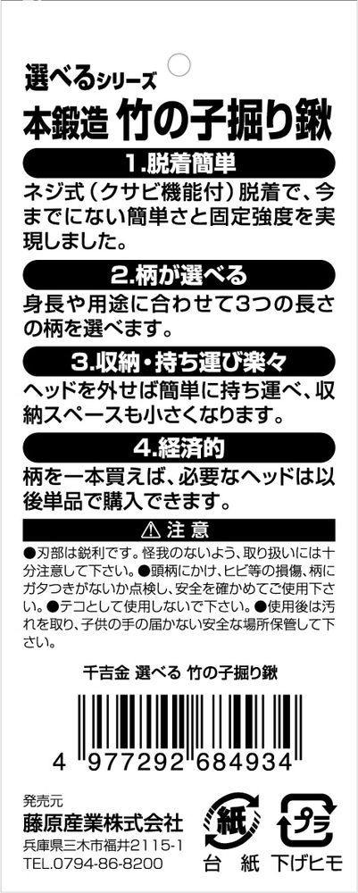 | ・タイプ:竹の子掘り ・本体サイズ(約):長さ285×幅70mm ・頭部:本鍛造品 ・関連商品:千吉選べる鍬シリーズ用柄・各サイズ ・材質:刃物鋼 |