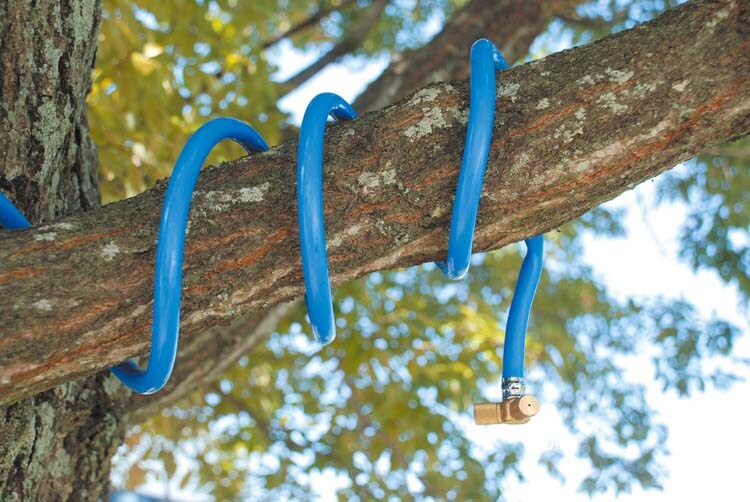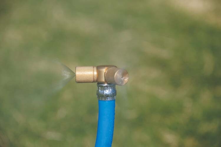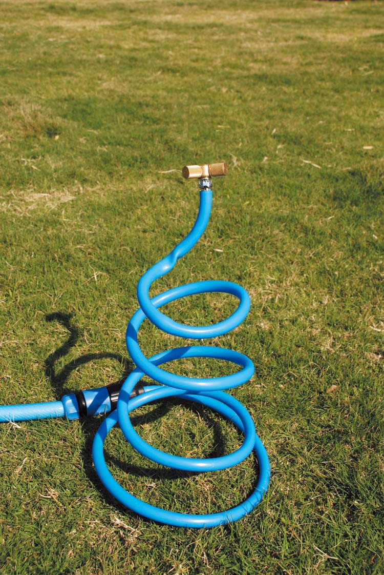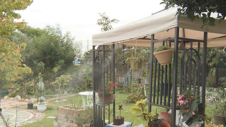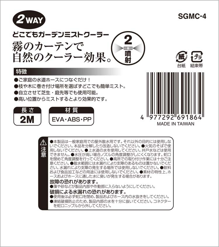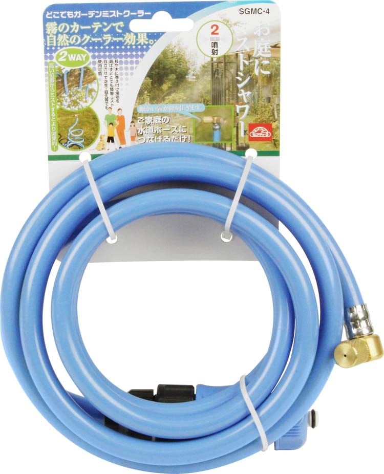 蛇口につないで簡単にガーデンミスト、水道水を水道圧でミストに変化させます。軒下・ベランダ・庭先・グランド等設置場所は様々です。枝や木に巻き付け場所を選らばず、どこででも簡単にミストができます。自立させて芝生・庭先等でも使用可能です。高い位置からミストするとより効果的です。霧のカーテンで自然のクーラー効果をもたらします。