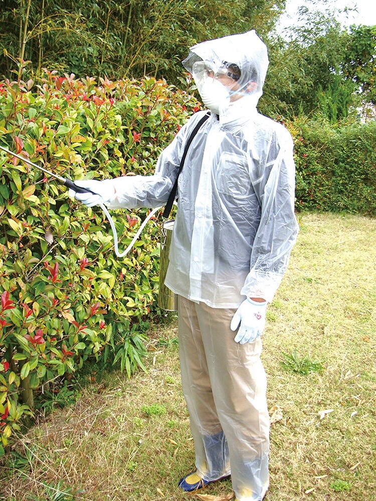 ●厚め(♯1500)の生地で強力防水、袖口より薬剤の侵入を防ぐ内袖付きです。