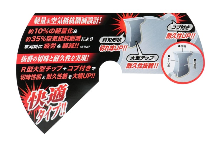 ●R形状チップ採用で草を逃がさず切味性能をあげています。