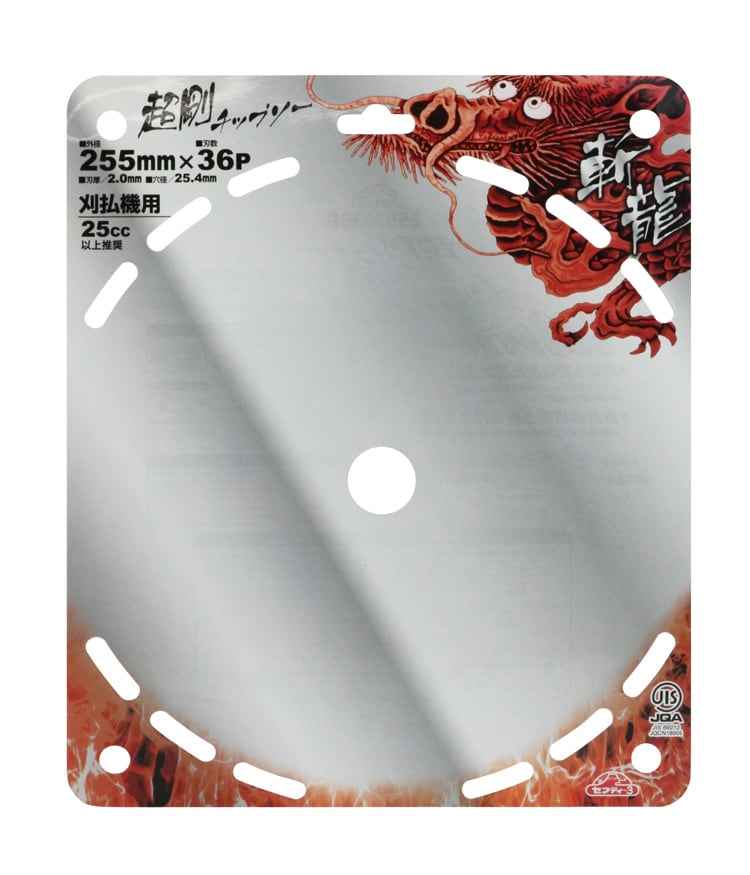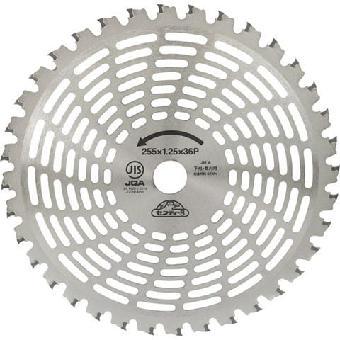 | JIS規格適合商品 外形:255mm 刃数:36P 刃厚:2.0mm 穴径:25.4mm 推奨:25cc以上 |