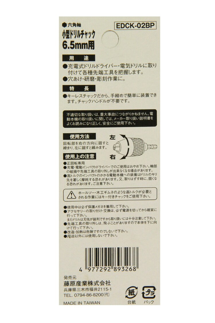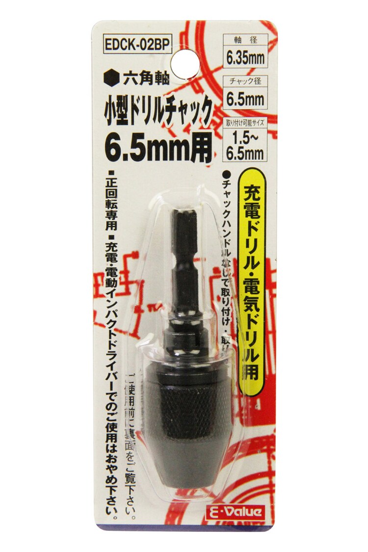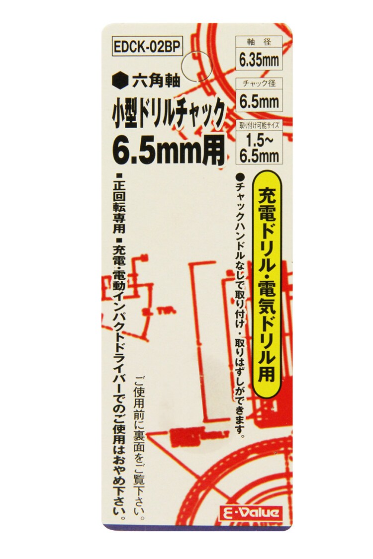 | 取り付け可能サイズ:1.5~6.5mm 6.35mm六角軸 チャック径:6.5mm 適応機種:充電ドリル・電気ドリル 正回転専用 |