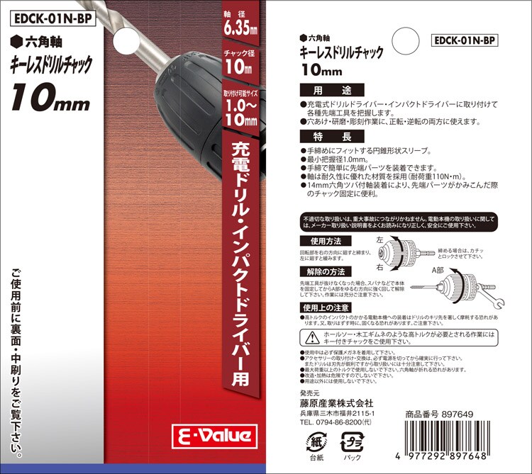 【E-Value 六角軸 キーレスドリルチャック 黒 EDCK-01NB-BPの商品詳細】