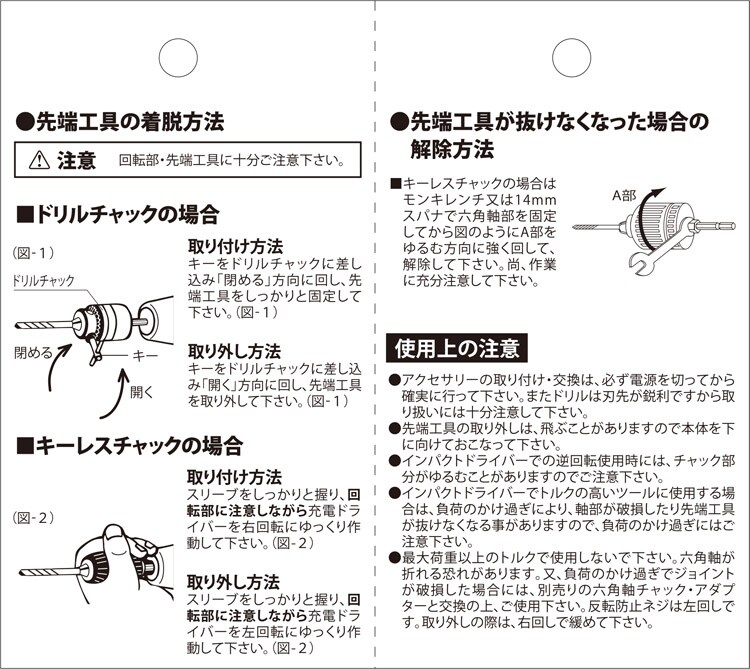 | ・取り付け可能サイズ:1.0~10.0mm ・6.35mm六角軸 ・チャック径:10.0mm ・適応機種:充電ドリル・インパクトドライバー ・カラー:黒 |