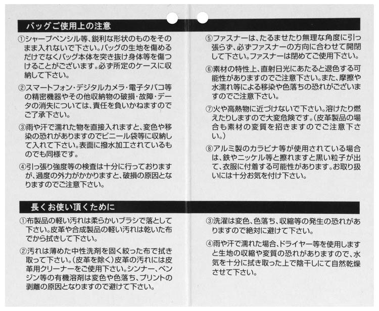 ・スマートフォン、デジタルカメラ、電子タバコ等の精密機器やその他収納物の破損、故障、データの消失については、責任を負いかねますのでご了承ください。