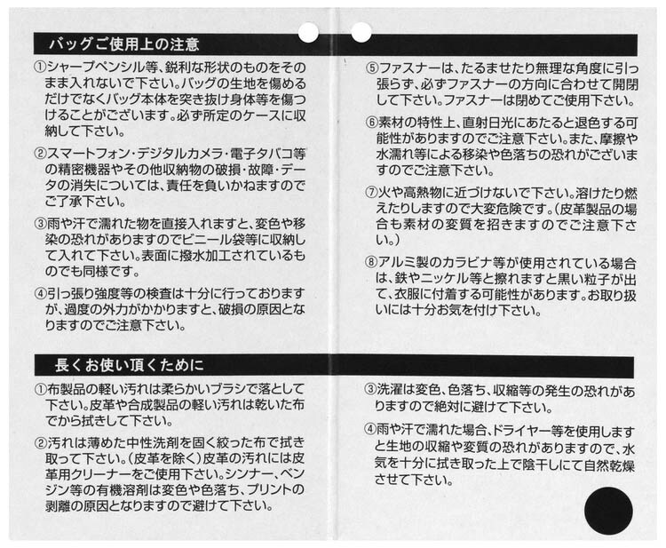 ・シャープペンシル等、鋭利な形状の物をそのまま入れないでください。バッグの生地を痛めるだけでなくバッグ本体を突き抜け身体等を傷つけることがございます。必ず所定のケースに収納して下さい。