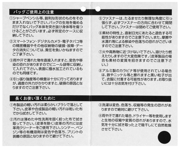 ・シャープペンシル等、鋭利な形状の物をそのまま入れないでください。バッグの生地を痛めるだけでなくバッグ本体を突き抜け身体等を傷つけることがございます。必ず所定のケースに収納して下さい。