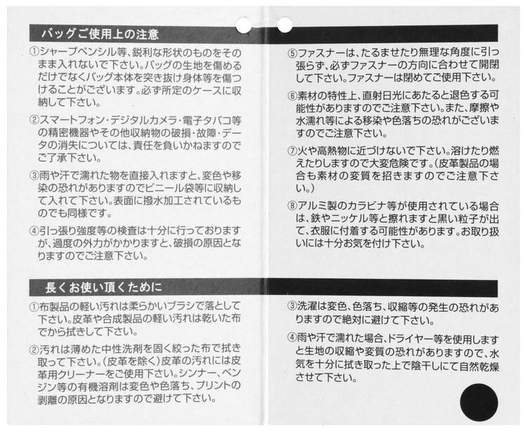 ・シャープペンシル等、鋭利な形状の物をそのまま入れないでください。バッグの生地を痛めるだけでなくバッグ本体を突き抜け身体等を傷つけることがございます。必ず所定のケースに収納して下さい。