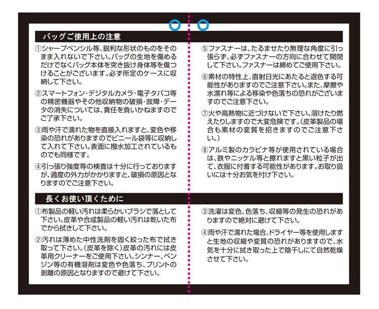 (1)シャープペンシル等、鋭利な形状のものをそのまま入れないでください。バッグの生地を傷めるだけでなくバック本体を突き抜け身体等を傷つけることがございます。必ず所定のケースに収納して下さい。