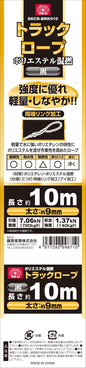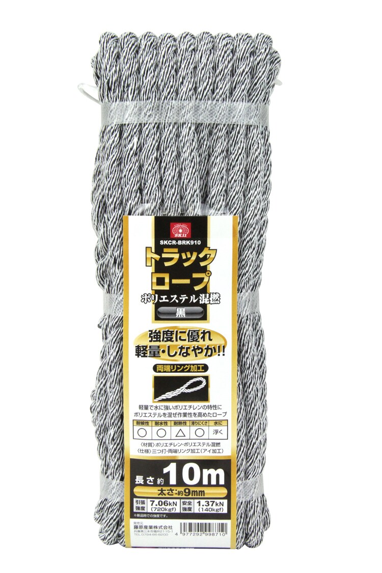 | 長さ:約10m。太さ:約9mm。引張強度:7.06kN(720kgf)。安全強度:1.37kN(140kgf)。カラー:黒。三つ打・両端リング加工(アイ加工)。(材質)ポリエチレン。ポリエステル。 |