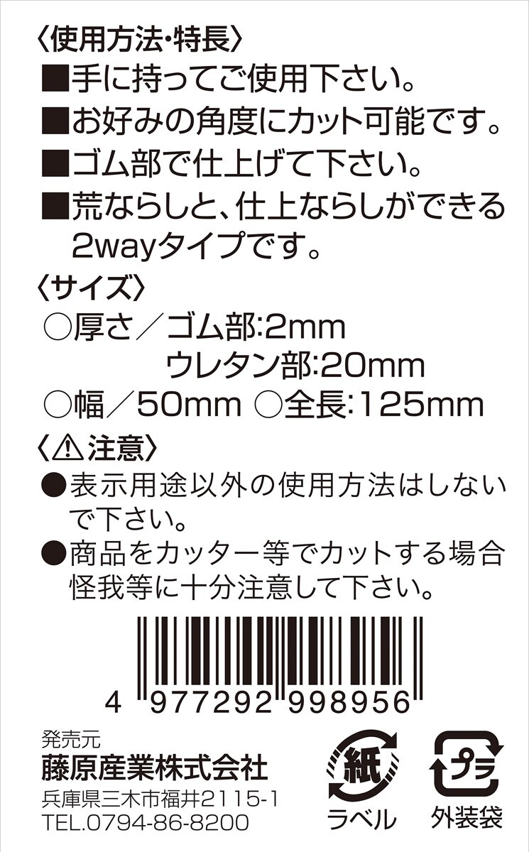 | 全長:125mm。厚さ:ゴム部2mm・ウレタン部20mm。幅:50mm。スポンジ硬度:ハード。入数:4枚。(材質)ポリエチレン。ゴム。 |