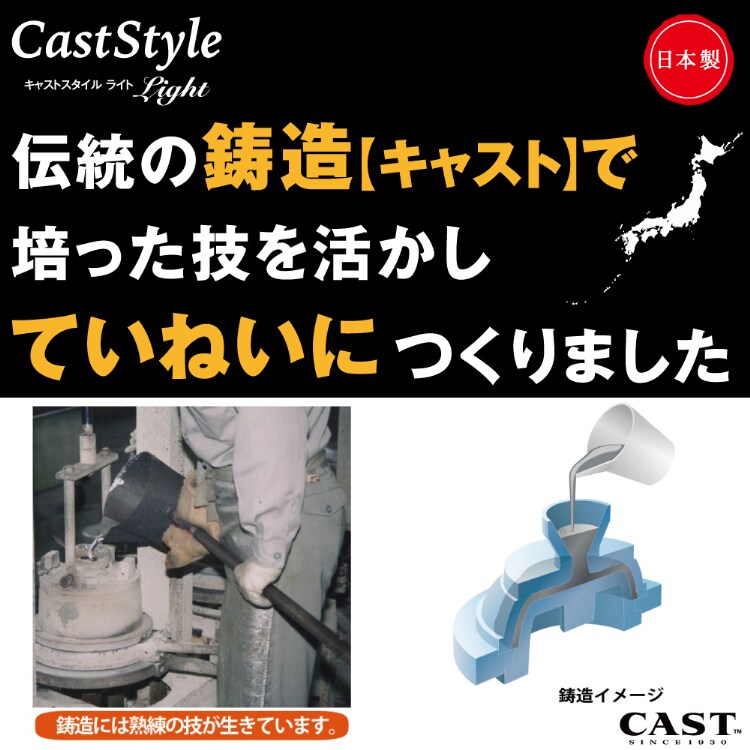 歴史ある鋳物(いもの)の街として知られる富山県高岡市。キャストスタイルライトは、その鋳造(ちゅうぞう)技術を活かして作る「アルミキャスト」製フライパンです。