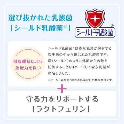 ●「シールド乳酸菌」は森永乳業が保有する数千株の中から選ばれた乳酸菌です。盾(シールド)のように外部からの敵を防御することをイメージして森永乳業が命名しました。(※「シールド乳酸菌」は森永乳業(株)の登録商標です。)
