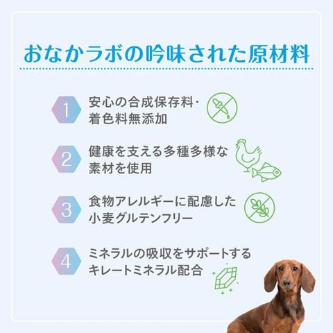 ●乳酸菌ミックスとオリゴ糖が腸内フローラ(細菌そう)のバランスを整え、毎日の食事を通して「腸からはじめるワンちゃんの健康生活」を提案します。