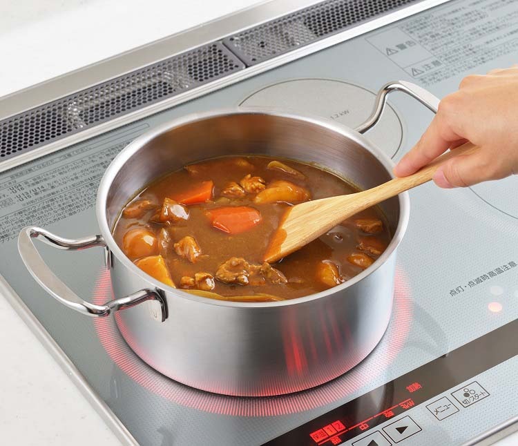 | 商品サイズ(約):全幅33.4×外径21.6×高さ13.7cm・内径20cm・深さ9cm 商品重量(約):960g 材質:本体/18-0ステンレス(底の厚さ/1.0mm)、ハンドル・フタ・ツマミ/18-0ステンレス 満水容量:2.9L、対応熱源:ガス火・IH |