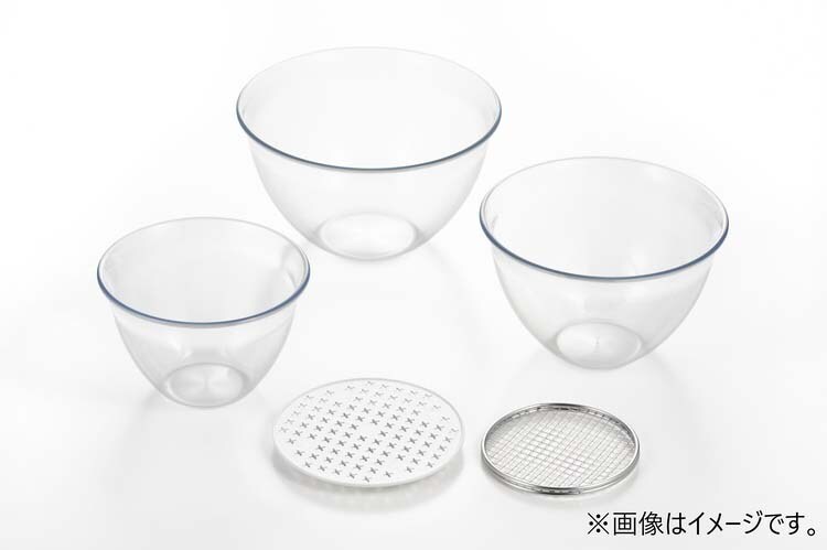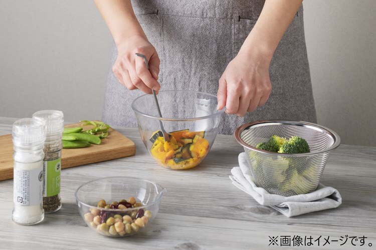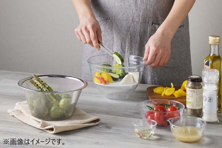 ●ガラスのような透明度の樹脂ボウル。ポイントは調理の負担にならない軽さ。