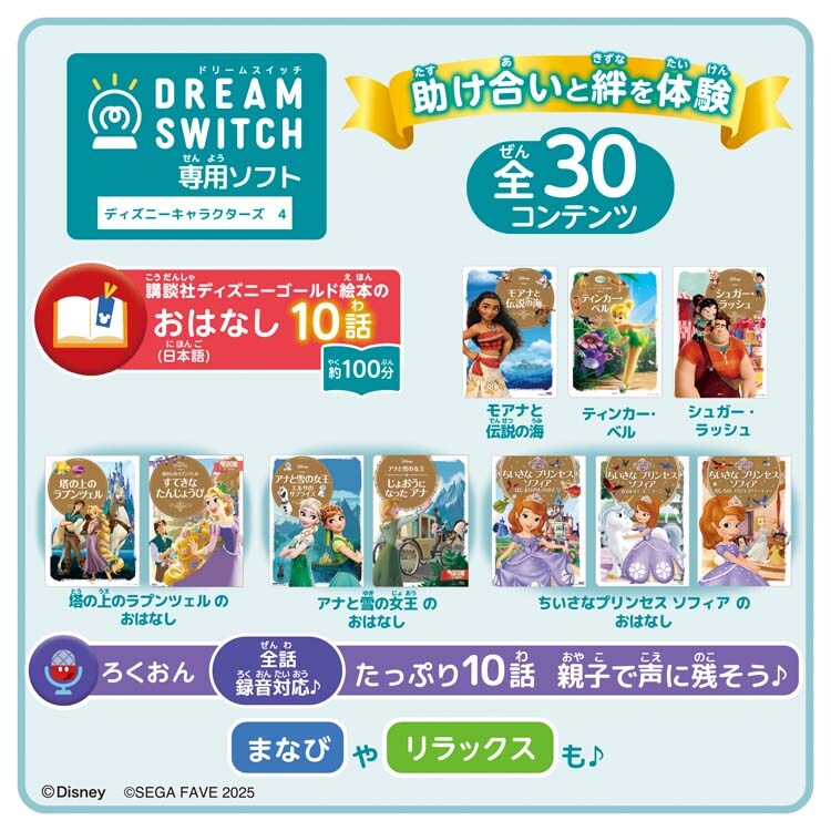 ●DREAM SWITCH(ドリームスイッチ)で「塔の上のラプンツェル」や「モアナと伝説の海」、「ちいさなプリンセスソフィア」等の読み聞かせができる専用ソフトです。