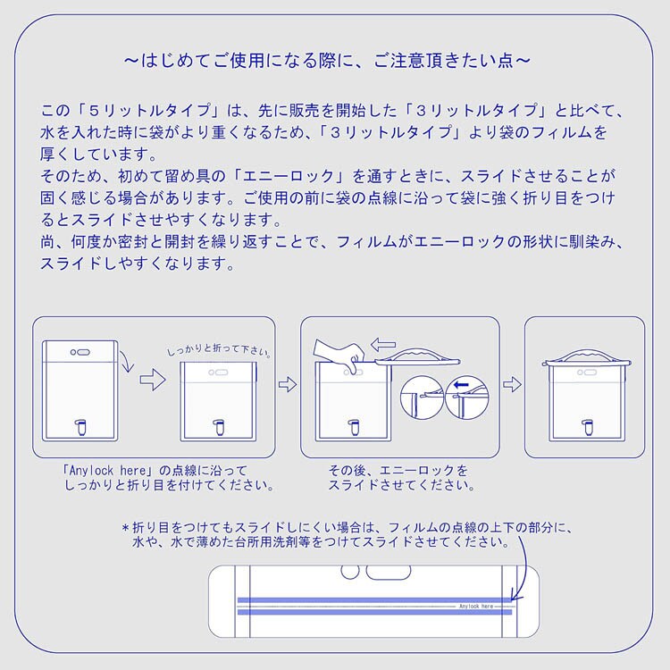 ・初めて使用するときは、留め具(エニーロック)を通す時にスライドしにくく、固く感じる場合がございます。その場合は、袋の上部の「Anylockhere」の点線部分に折り目を強めにつけるとスライドしやすくなります。