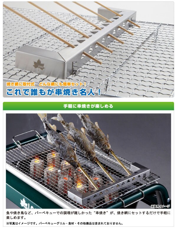 ●焼き網にセット可能なフックと2点で支える三角形の串穴で食材を安定