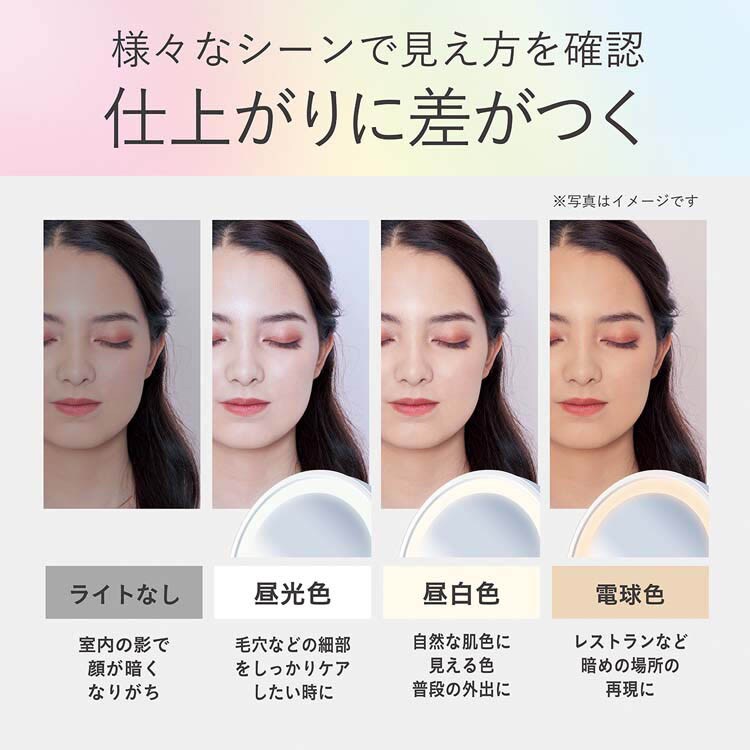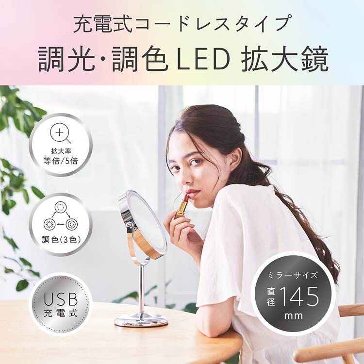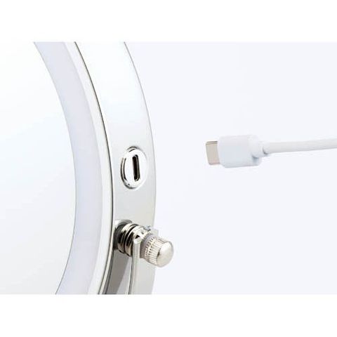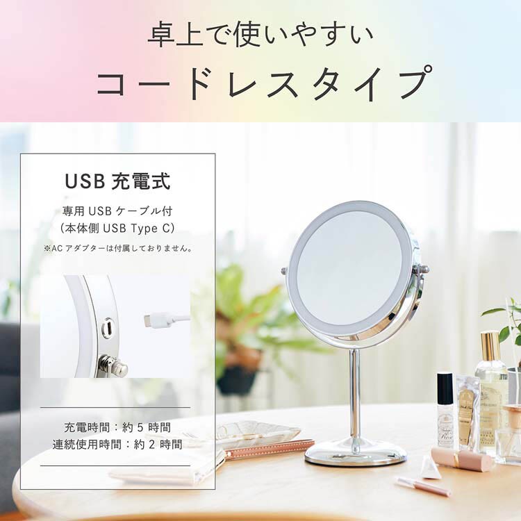 | ★本体サイズ:(幅)20.8×(奥行)12.8×(高さ)32.3cm ★本体重量:730g ★拡大率:1倍/5倍(裏表回転式) ★鏡サイズ:φ約145mm ★電源:DC5V1A ★入力端子:USB Type C ★定格入力:DC5V1A ★充電池:リチウムイオンポリマー充電池 ★定格容量:1000mAh ★ワット時定格容量:3.7Wh ★消費電力値:5W(充電時) ★充電時間:約3時間 ★電池持続時間:約90分 ★調光機能:電源/調光スイッチ長押し ★調色機能:昼光色/電球色/昼白色 ★付属品:USBケーブル ★コード長:USBコード長:90cm |