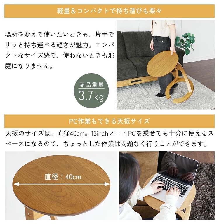 ●天板のサイズは直径約40cm、13inchノートPCを乗せても十分に使えるスペースになるので、ちょっとした作業は問題なく行うことができます。