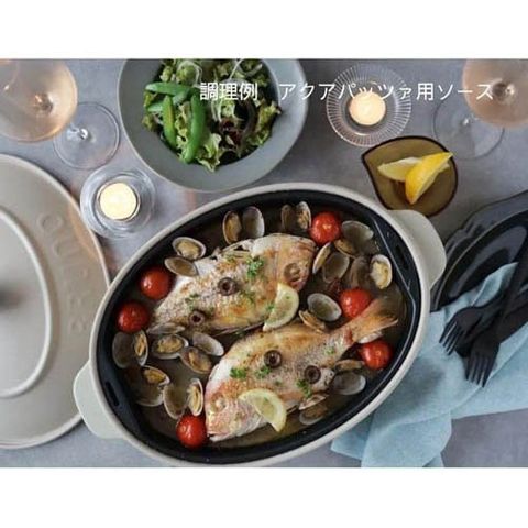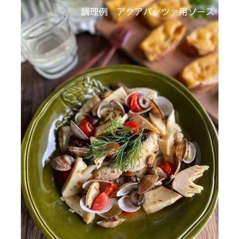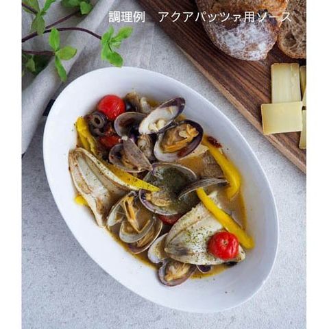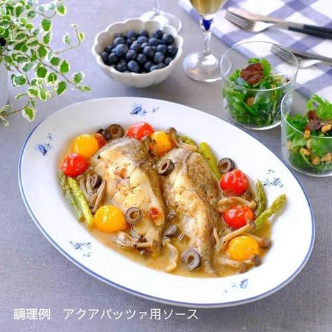●白ワインをベースに、さわやかなレモンとハーブを効かせたアクアパッツァ用ソースです。アクアパッツァとは、魚介類をトマトとオリーブなどとともに煮込んだイタリア料理です。