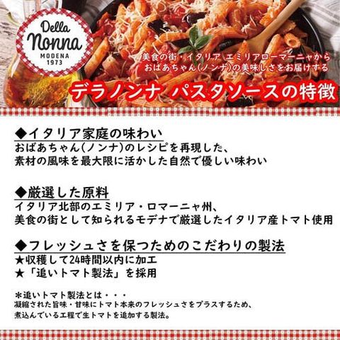 ・料理上手なノンナのレシピは、イタリアの家庭で大切に受け継がれてきました。 そんなイタリア家庭のレシピを手軽に味わえるよう工夫を重ね、素材の風味を最大限にいかした自然で優しい味わいのパスタソースが「デラノンナ」です。