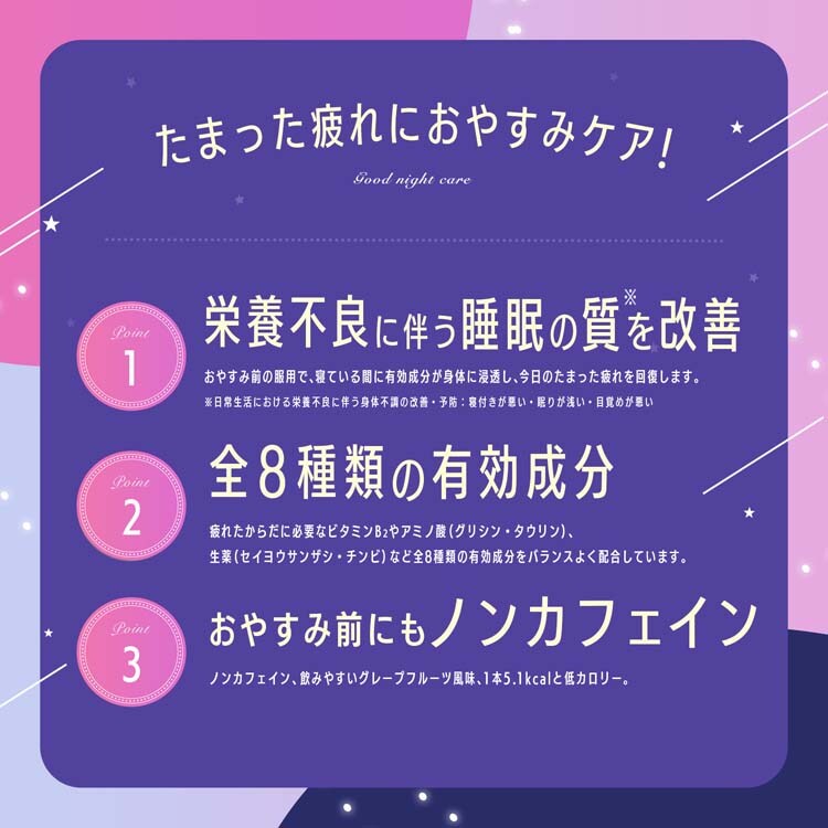 ●おやすみ前の服用で、寝ている間に有効成分が身体に浸透し、今日のたまった疲れを回復します。