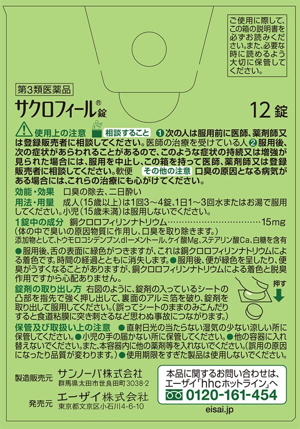 | (1錠中) 銅クロロフィリンナトリウム:15mg 添加物として、トウモロコシデンプン、dL-メントール、けい酸Mg、ステアリン酸Ca、白糖を含有 ※服用後、舌の表面に緑色がつきますが、これは銅クロロフィリンナトリウムによる着色です。時間の経過とともに消失します。 ※服用後、便が緑色を呈したり、便臭がうすくなることがありますが、銅クロロフィリンナトリウムによる着色と脱臭作用ですから心配ありません。 |