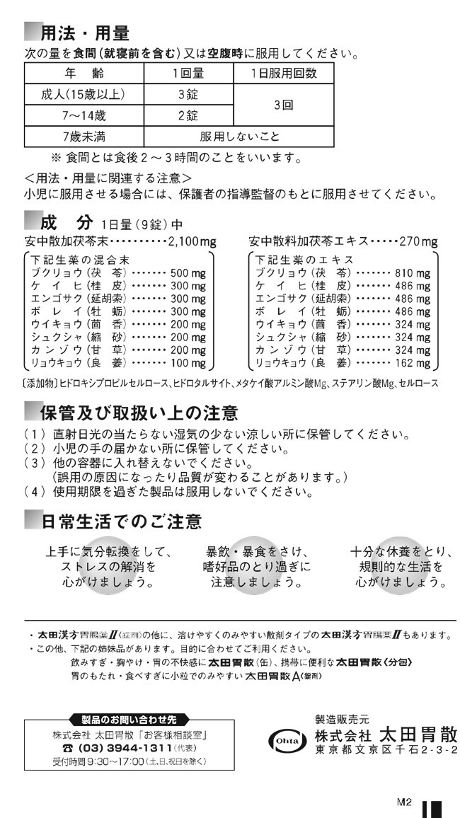 | 1日量(9錠)中 安中散加茯苓末:2100mg 下記生薬の混合末 ブクリョウ(茯苓):500mg ケイヒ(桂皮):300mg エンゴサク(延胡索):300mg ボレイ(牡蛎):300mg ウイキョウ(茴香):200mg シュクシャ(縮砂):200mg カンゾウ(甘草):200mg リョウキョウ(良姜):100mg 安中散料加茯苓エキス:270mg 下記生薬の混合末 ブクリョウ(茯苓):810mg ケイヒ(桂皮):486mg エンゴサク(延胡索):486mg ボレイ(牡蛎):486mg ウイキョウ(茴香):324mg シュクシャ(縮砂):324mg カンゾウ(甘草):324mg リョウキョウ(良姜):162mg (添加物)ヒドロキシプロピルセルロース、ヒドロタルサイト、メタケイ酸アルミン酸Mg、ステアリン酸Mg、セルロース |