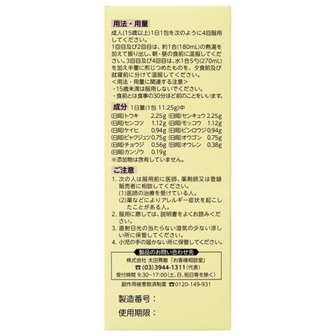 | 1日量(1包11.25g)中 (日局)トウキ:2.25g (日局)センキュウ:2.25g (日局)センコツ:1.12g (日局)モッコウ:1.12g (日局)ケイヒ:0.94g (日局)ビンロウジ:0.94g (日局)ビャクジュツ:0.75g (日局)オウゴン:0.75g (日局)チョウジ:0.56g (日局)オウレン:0.38g (日局)カンゾウ:0.19g ※添加物は含有していません。 ★成分に関連する注意 本剤は天然物(生薬)を用いているため、製品の色や味等に多少の差異が生じることがありますが、効果は変わりありません。 |