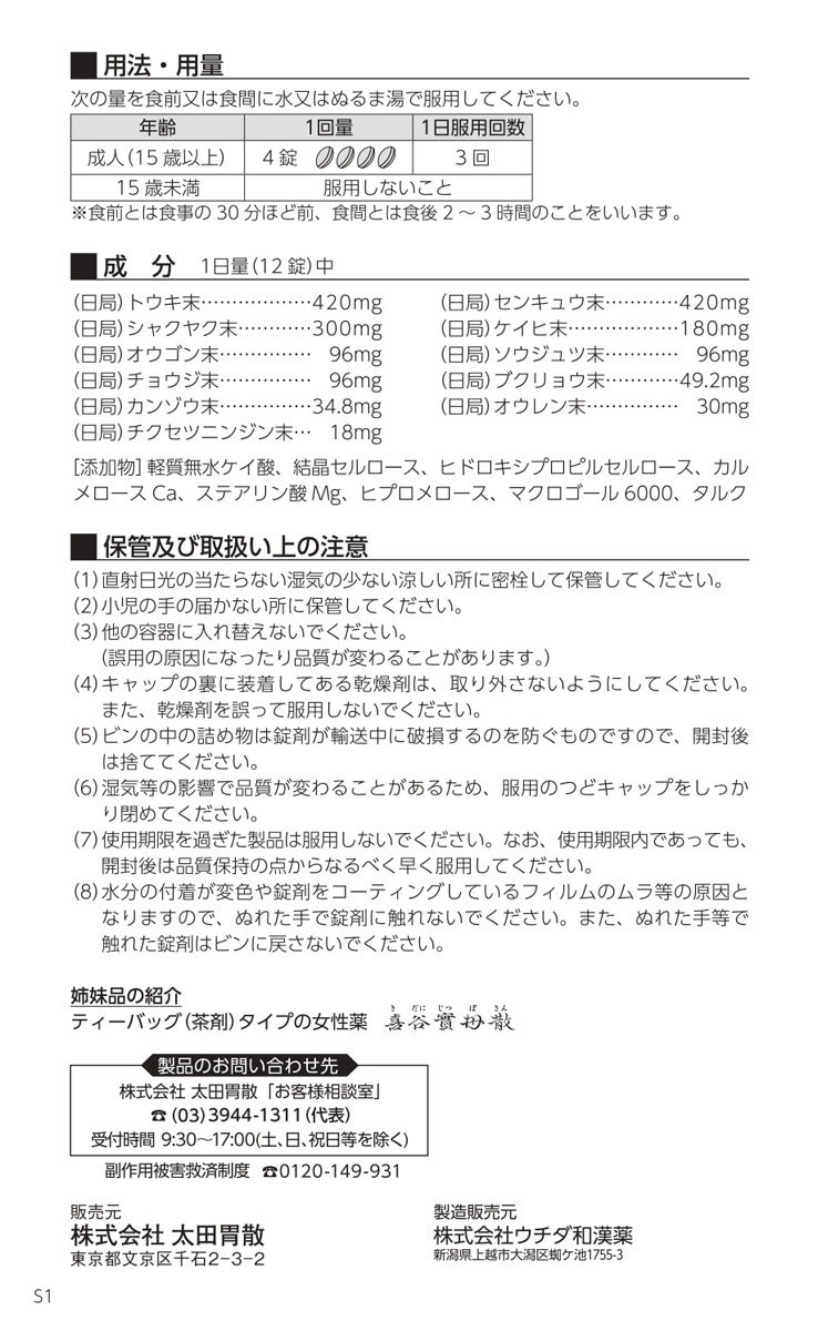 | 1日量(12錠)中 (日局)トウキ末:420mg (日局)センキュウ末:420mg (日局)シャクヤク末:300mg (日局)ケイヒ末:180mg (日局)オウゴン末:96mg (日局)ソウジュツ末:96mg (日局)チョウジ末:96mg (日局)ブクリョウ末:49.2mg (日局)カンゾウ末:34.8mg (日局)オウレン末:30mg (日局)チクセツニンジン末:18mg 添加物:軽質無水ケイ酸、結晶セルロース、ヒドロキシプロピルセルロース、カルメロースCa、ステアリン酸Mg、ヒプロメロース、マクロゴール6000、タルク |