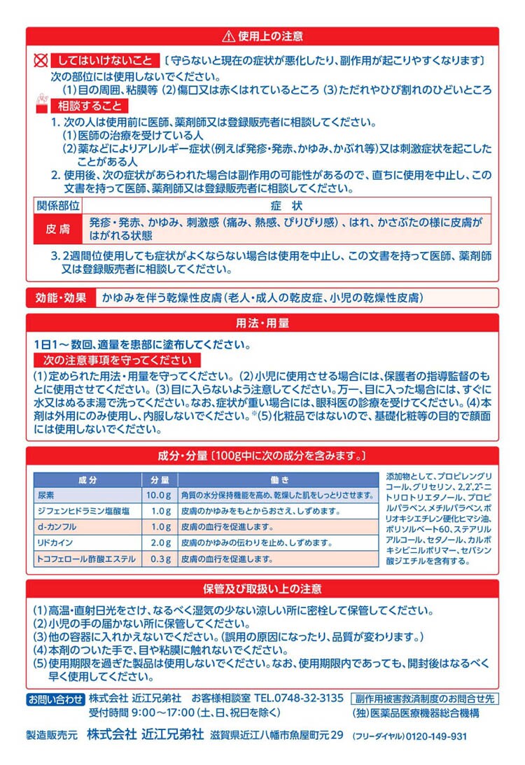 尿素:10.0g:角質の水分保持機能を高め、乾燥した肌をしっとりさせます。