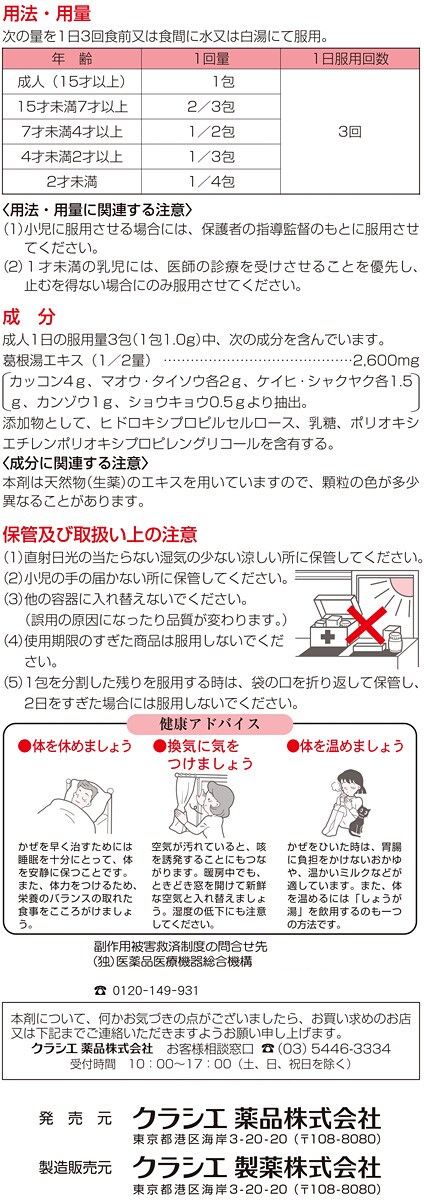 | (3包(3.0g)中) 葛根湯エキス(1/2量):2600mg (カッコン4g、マオウ・タイソウ各2g、ケイヒ・シャクヤク各1.5g、カンゾウ1g、ショウキョウ0.5gより抽出。) 添加物:ヒドロキシプロピルセルロース、乳糖、ポリオキシエチレンポリオキシプロピレングリコール ※本剤は天然物(生薬)のエキスを用いていますので、顆粒の色が多少異なることがあります。 |