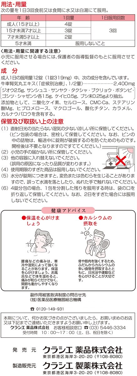 | (12錠中) 牛車腎気丸エキス(「症候別治療」、1/2量):2400mg (ジオウ2.5g、サンシュユ・サンヤク・タクシャ・ブクリョウ・ボタンピ・ゴシツ・シャゼンシ各1.5g、ケイヒ0.5g、ブシ末0.25gより抽出。) 添加物:二酸化ケイ素、セルロース、CMC-Ca、ステアリン酸Mg、ヒプロメロース、マクロゴール、酸化チタン、カラメル、カルナウバロウ |