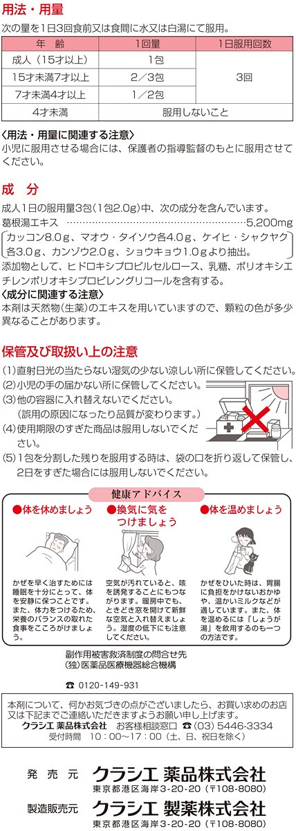 | (3包(6.0g)中) 葛根湯エキス:5200mg (カッコン8.0g、マオウ・タイソウ各4.0g、ケイヒ・シャクヤク各3.0g、カンゾウ2.0g、ショウキョウ1.0gより抽出。) 添加物:ヒドロキシプロピルセルロース、乳糖、ポリオキシエチレンポリオキシプロピレングリコール ※本剤は天然物(生薬)のエキスを用いていますので、顆粒の色が多少異なることがあります。 |